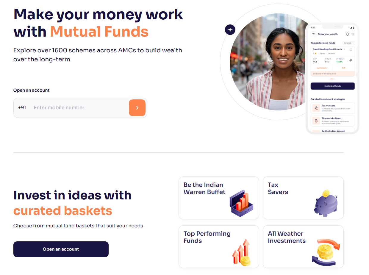 Trade across 5,000+ stocks on NSE and BSE. Both delivery (CNC) and intraday (MIS) trading supported. Portfolio tracking, SIP in stocks, and margin trading facility (MTF) up to 6x leverage on eligible Group I securities (at 18% annual interest rate on borrowed funds).